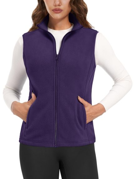 Women’S Anti-static Fleece Vest Lightweight Warm Stand Collar 4 Pockets Zipper Front Elastic Armholes Sleeveless Outerwear For Travel Riding Camping Outdoor Activities