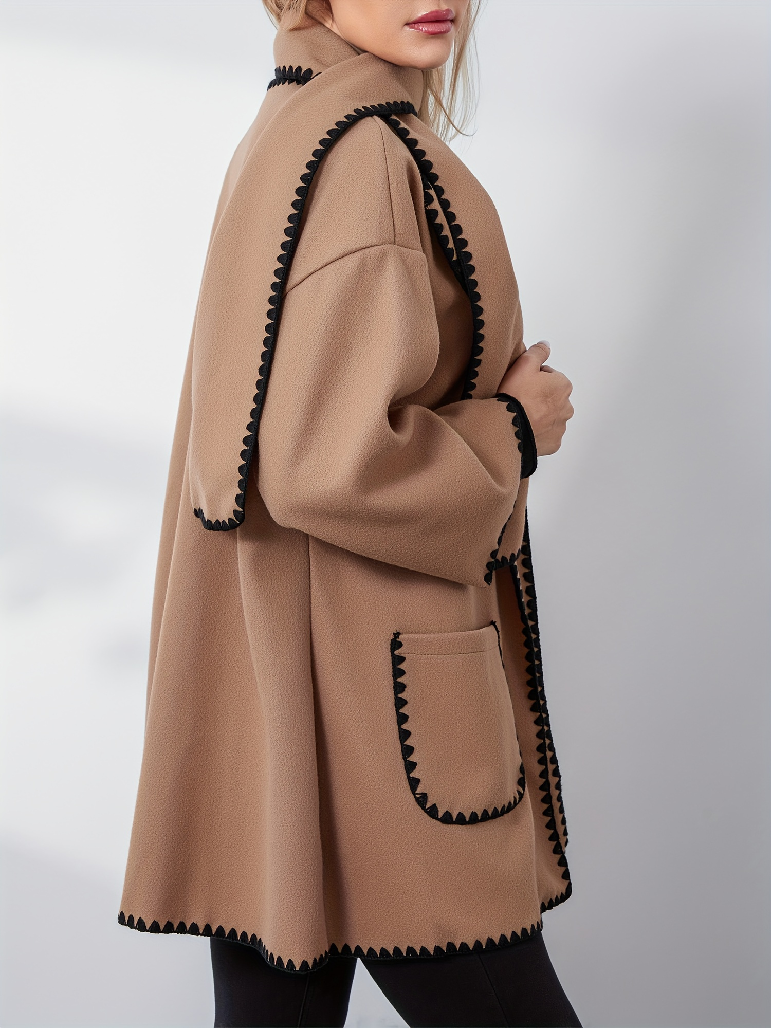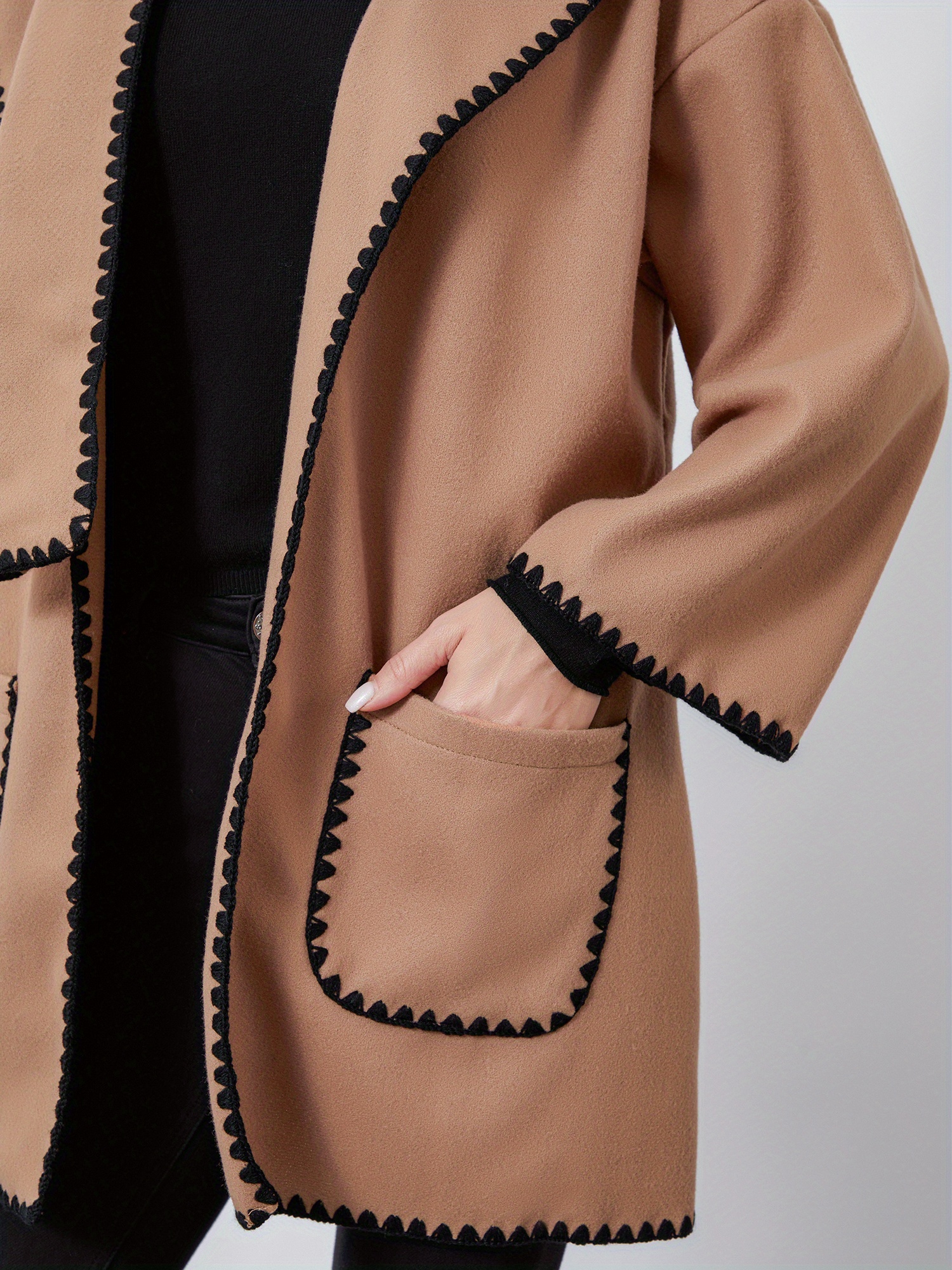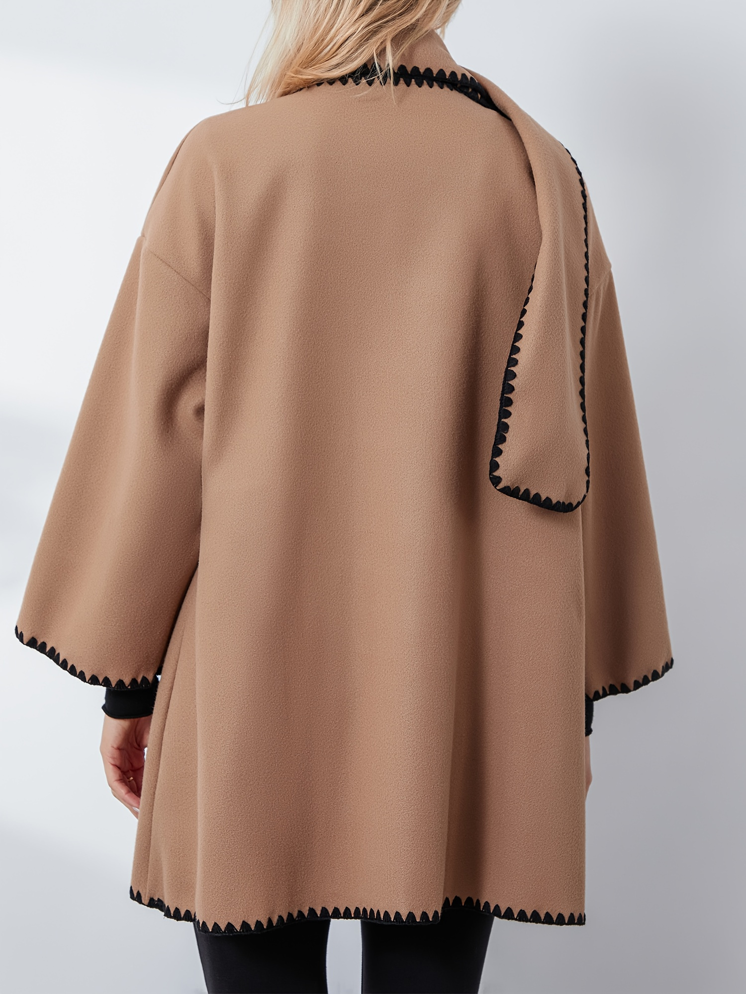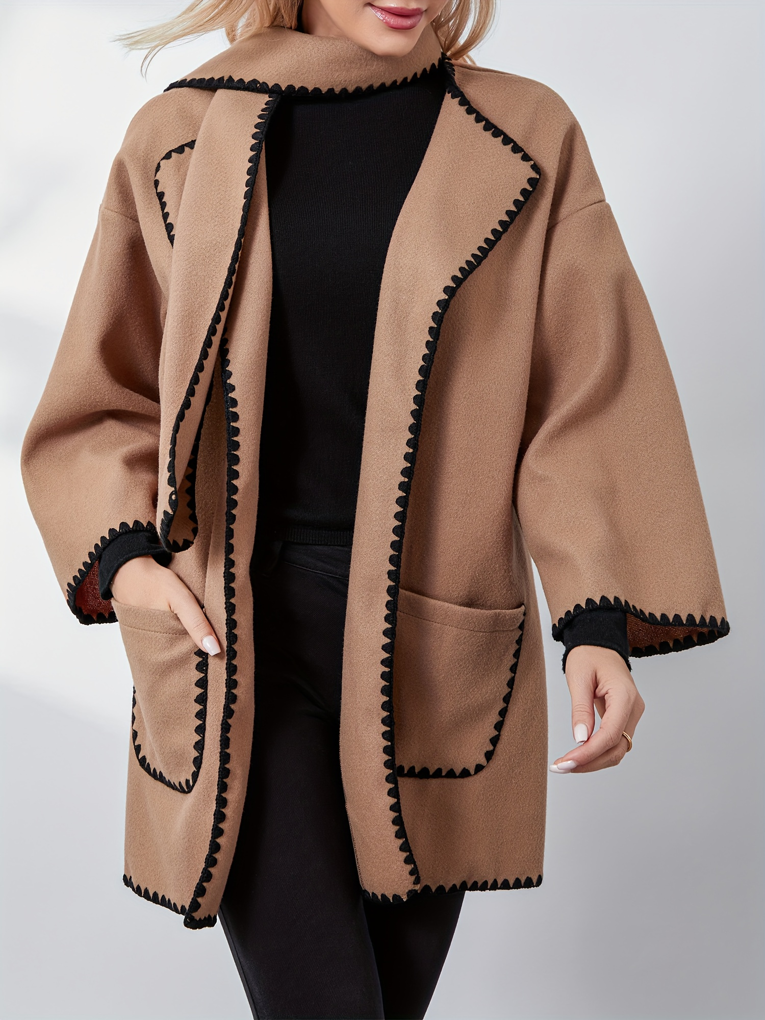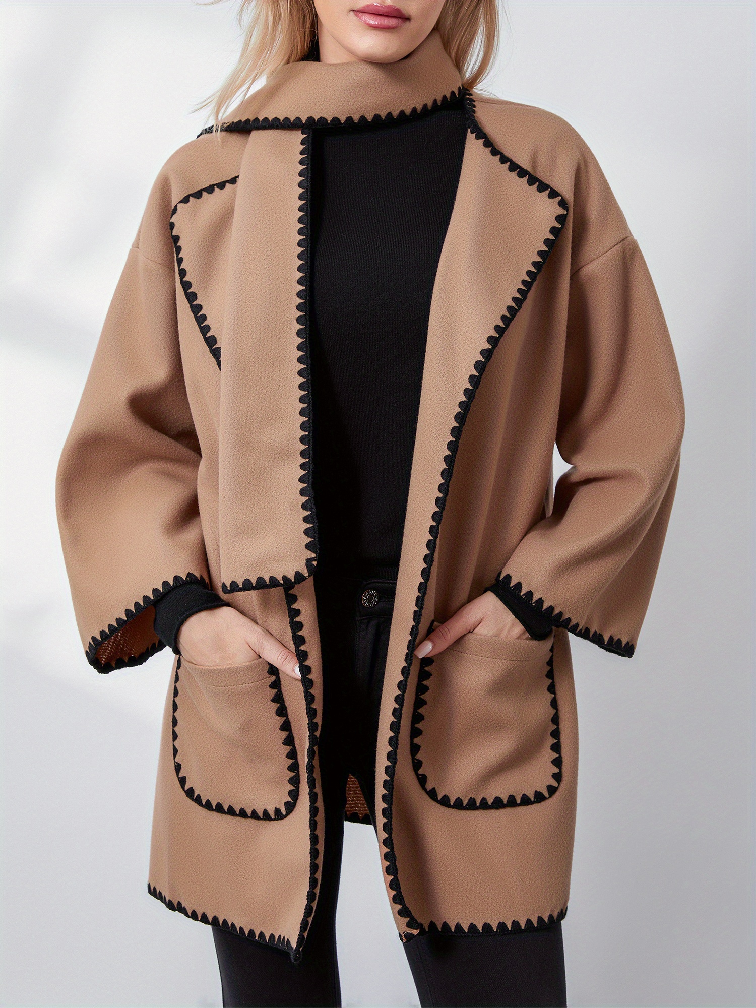 Two-Piece Winter Set Featuring a Loose Women’S Coat with a Turn- Collar And an Open Front, Complemented by a Contrasting Edge Scarf.