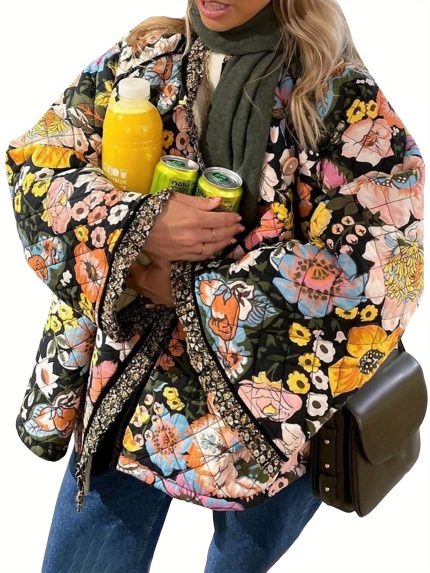 Women’S Floral Print Winter Jacket – Quilted, Long Sleeve, Padded Coat with Buttondown Front & Side Pockets, Casual Warm Outfit for Cold Weather, Winter Coa