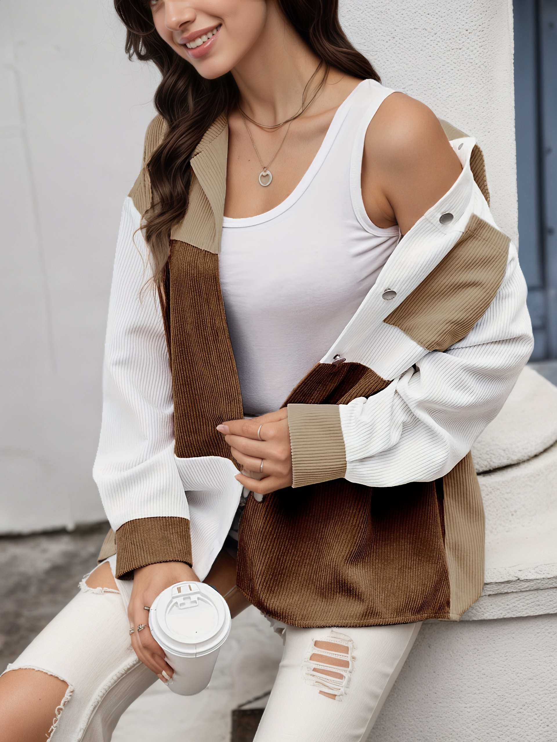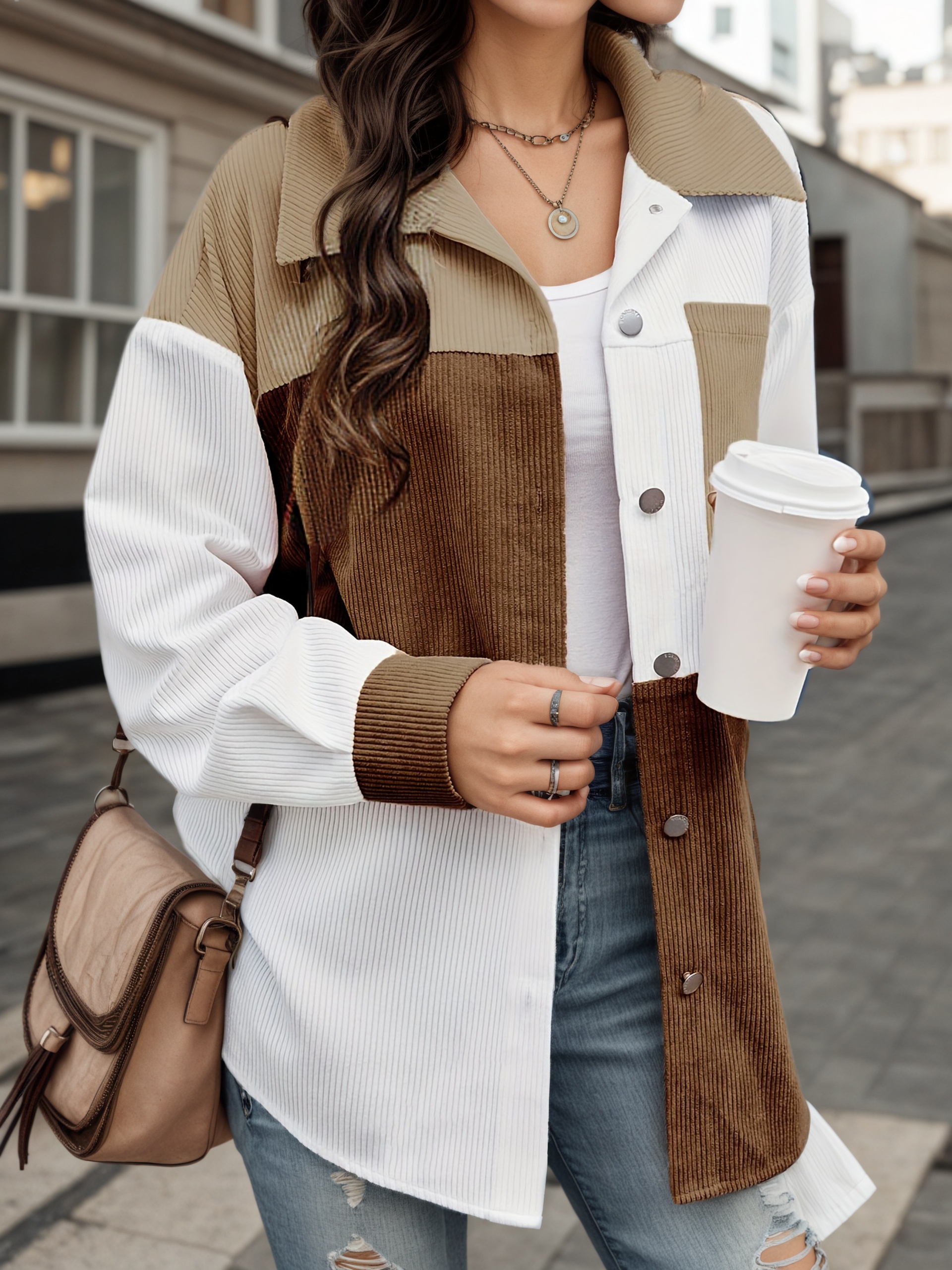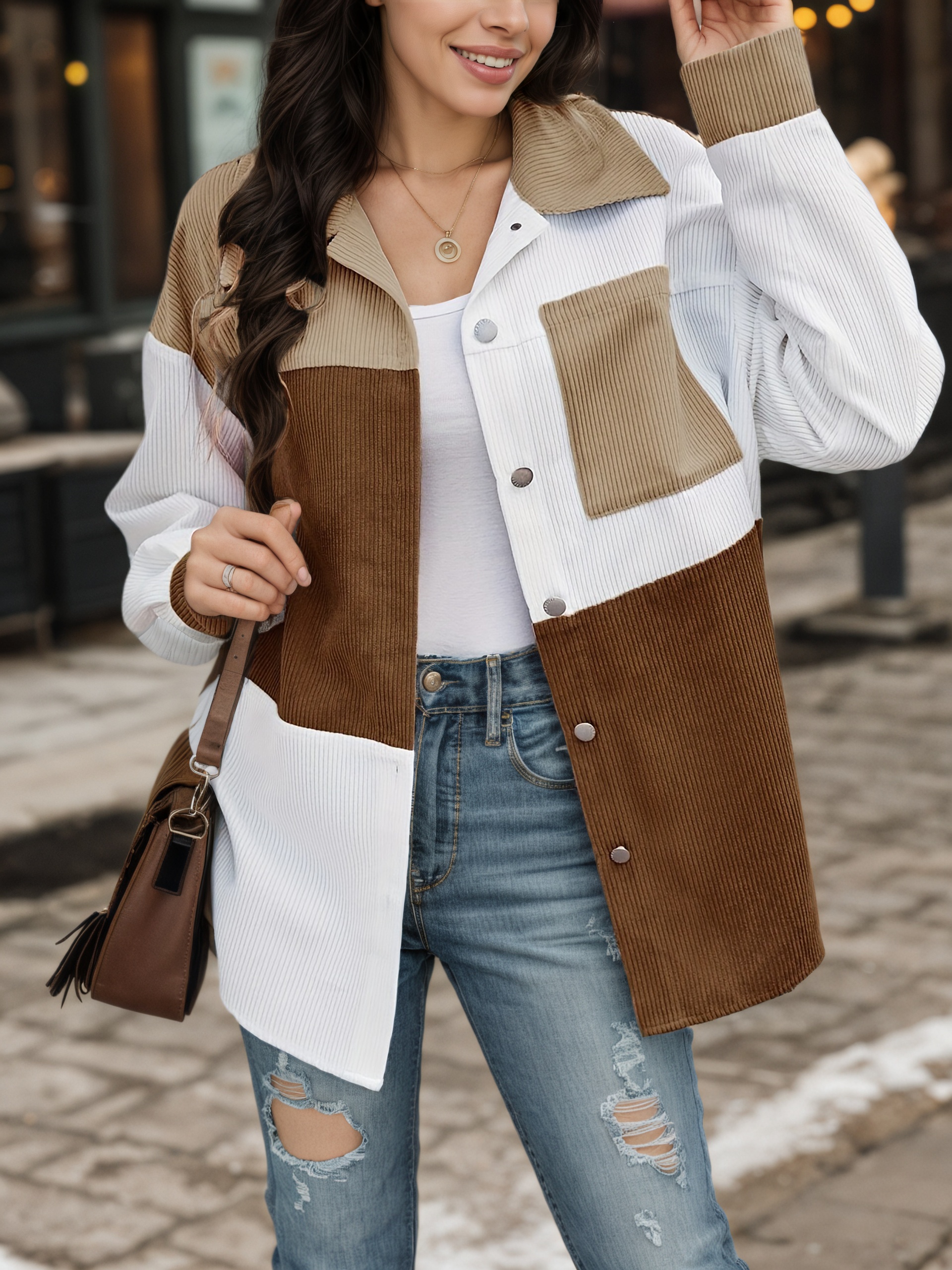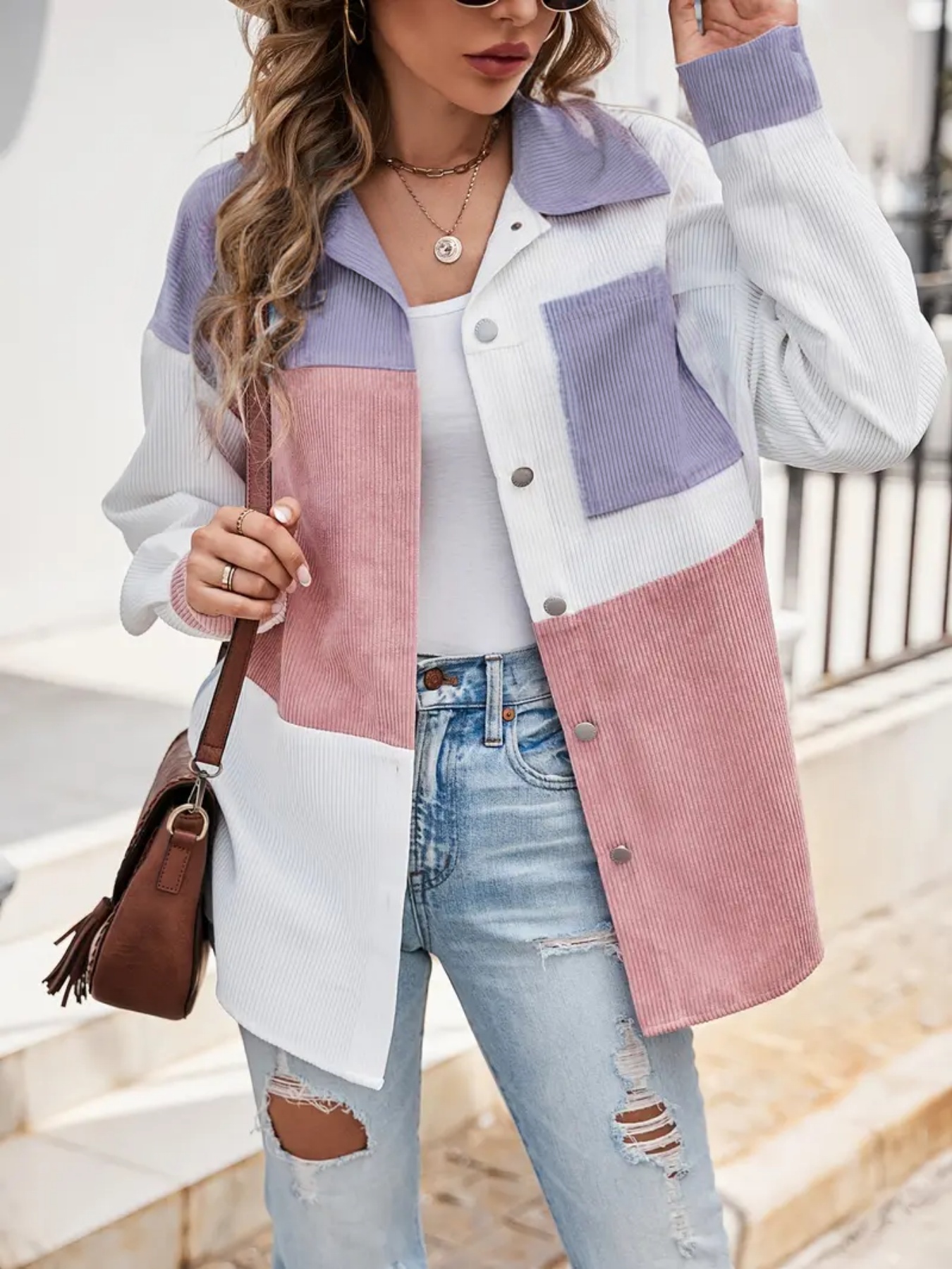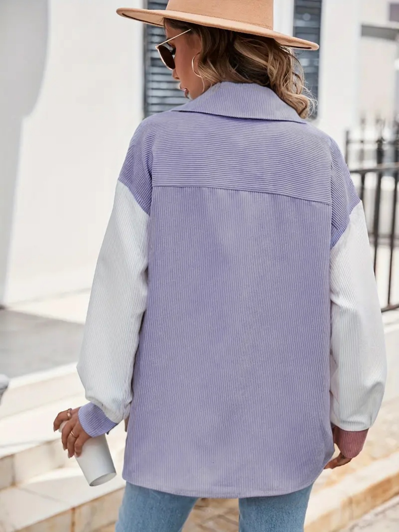 Women’S Autumn & Winter Jacket – Color-Block Corduroy Coat with Lapel Collar & Button Front Closure, Soft Light -Friendly Warm Outerwear, Casual to Semi-Formal Long Sleeve Jacket in PinkPurpleNavy, Single-Breasted Design for Fall Winter Layering