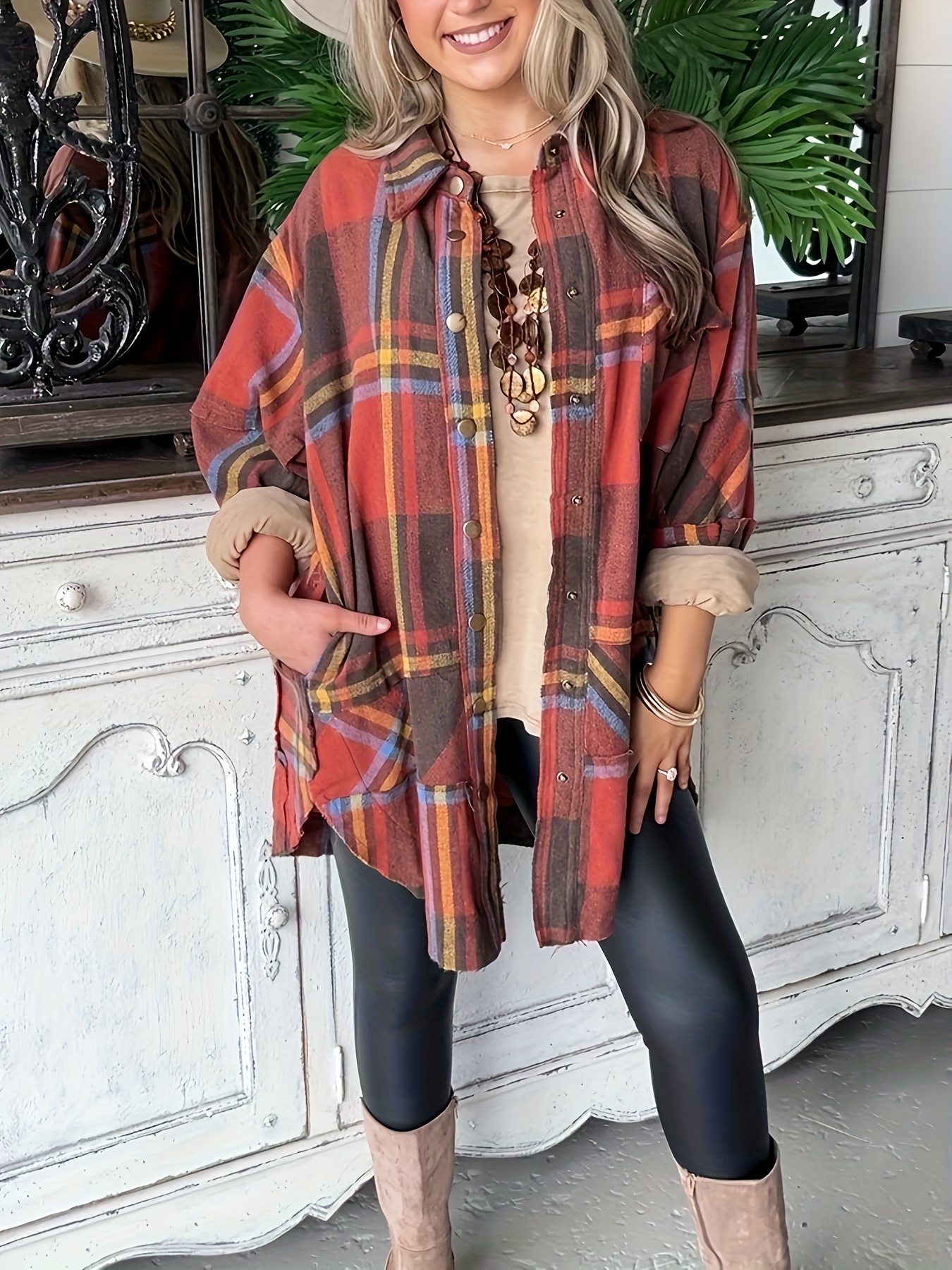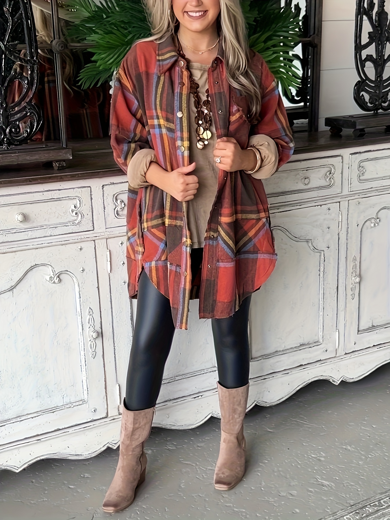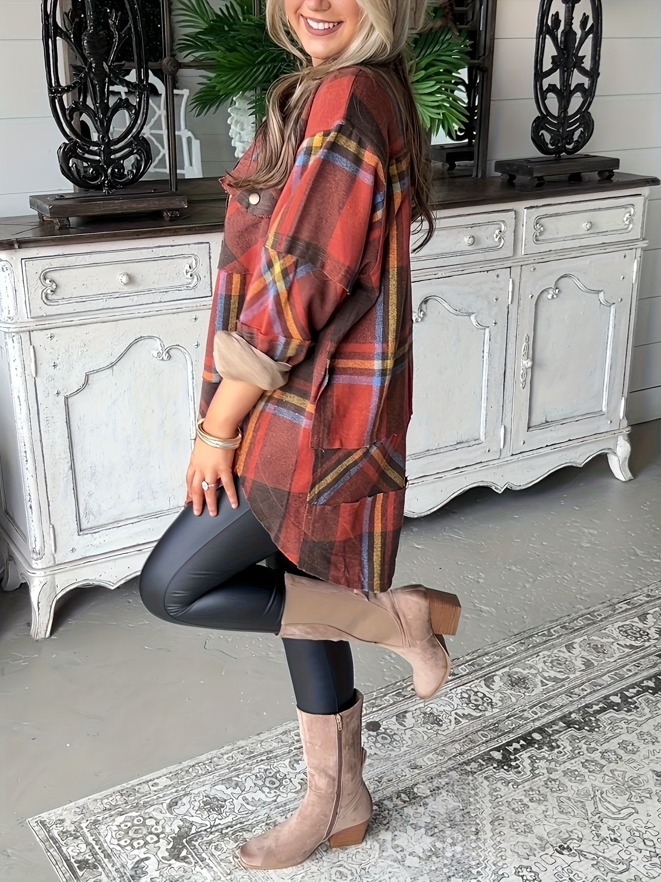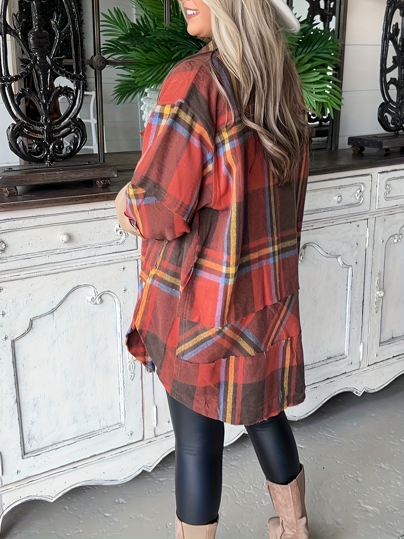 Home Women's Coats & Jackets Women’s Brushed Plaid Jacket – Metal Snap Front, Raw Stitching Detailing, Chest Pocket & Slant Pockets, Curved Hem Hip-Length Casual Coat for Autumnu002FWinter, Autumn Fashion, No Stretch Fabric, Streetwear Style, Trendy Outerwear, Durable Construction, Outerwear Piece, Street Style Lovers
